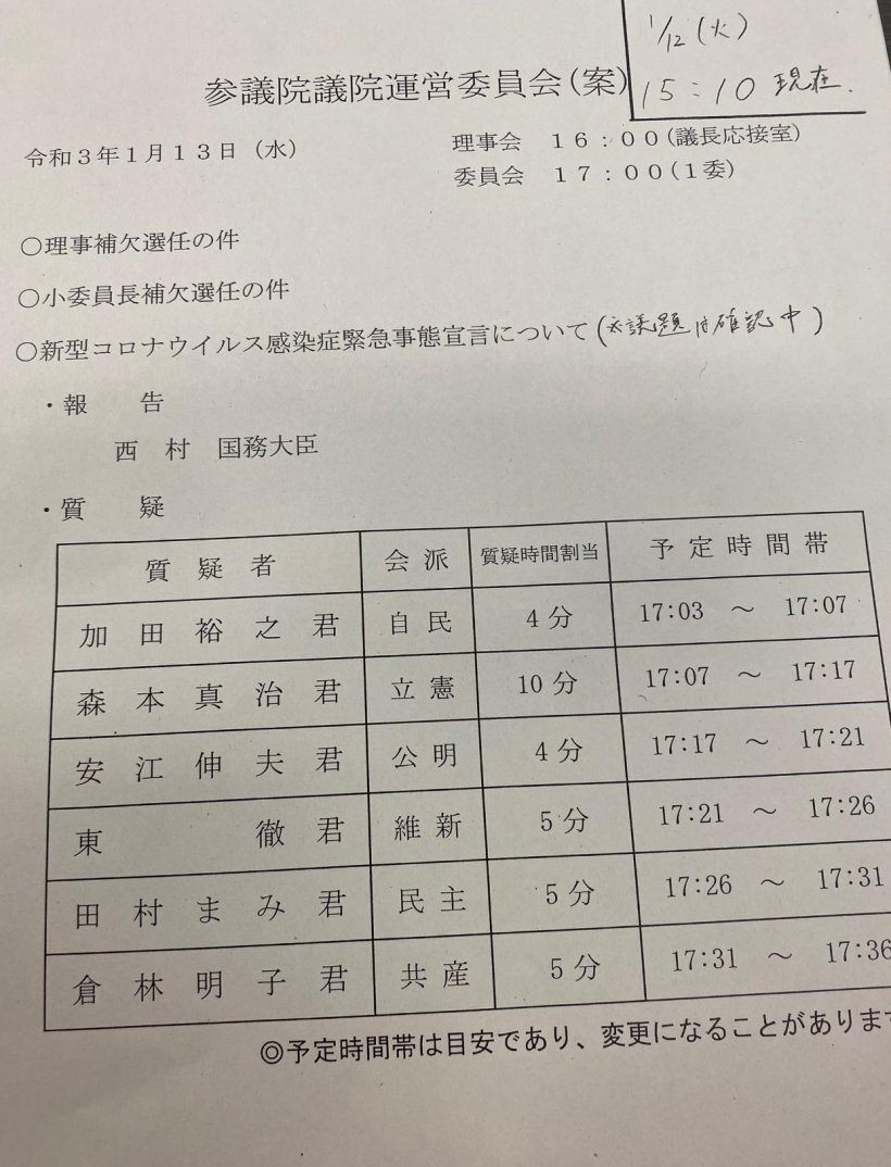 1月12日新型コロナウイルス感染症緊急事態宣言の区域の追加が行われる予定です。 参議院では17時から議院運営委員会で質疑を行いますが、 私が会派を代表して質疑に立ちます。NHKでも中継予定です。