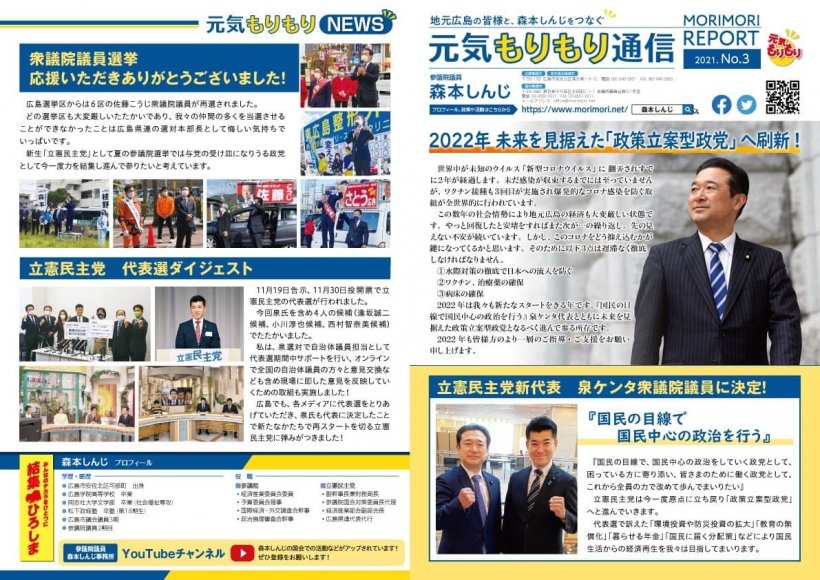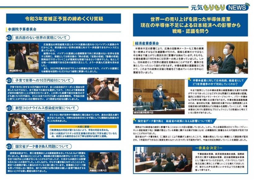もりもり通信2022年ができあがりました! 昨年末の予算委員会、経産委員会での質疑などをまとめています。 ぜひご覧ください。 広島もコロナの新規感染者数が激増し、まんえん防止等重点措置が適用されました。 とにかく政府には自治体任せにせず国としての迅速な対応を求めます。