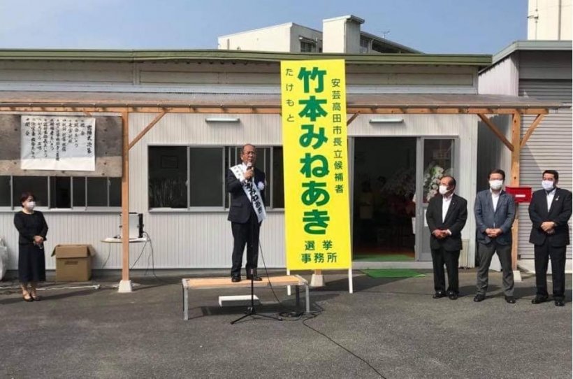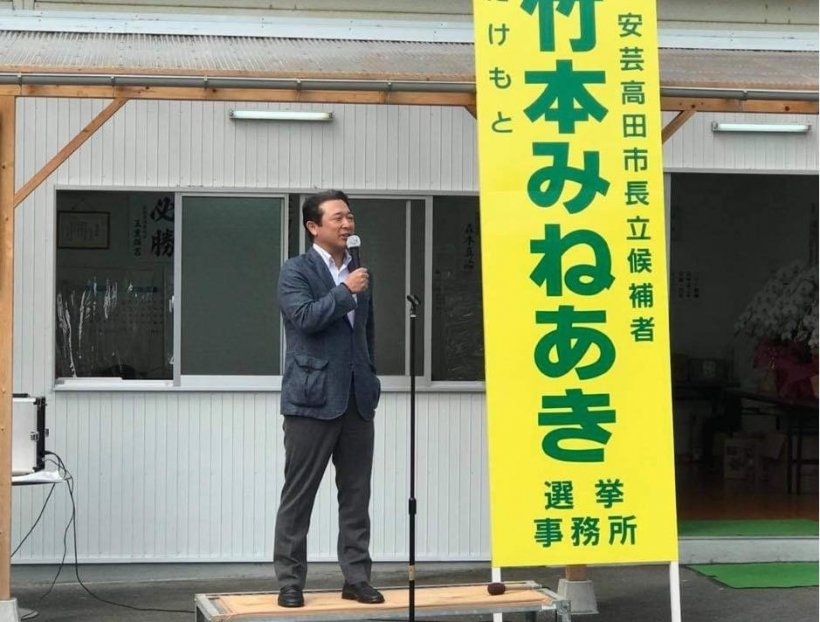 安芸高田市長選スタート。竹本みねあき候補の出発式に出席しました。 市政が混乱する中でも、人口減少、高齢化、中山間地域対策、防災対策等々、 難局を乗り切るため、竹本さんを先頭に、市民の結集を呼びかけました。