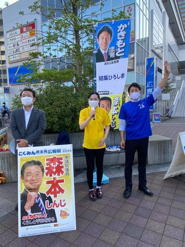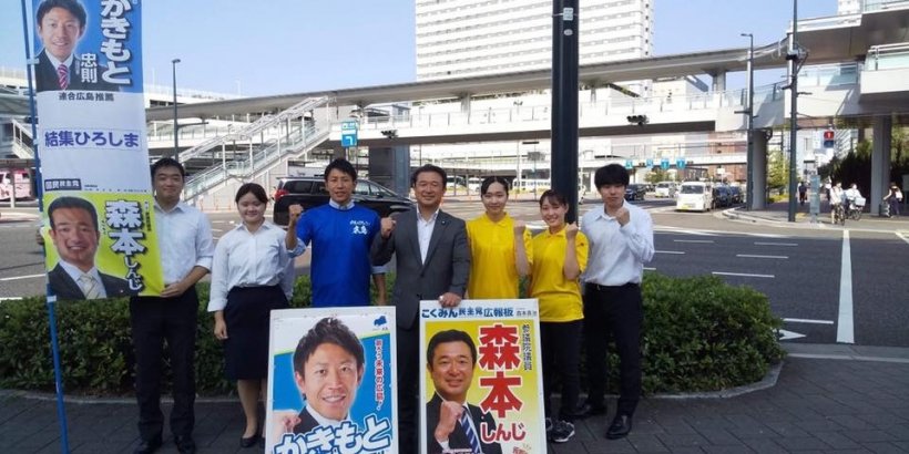今朝の街頭活動。柿本県会議員と。 森本事務所、柿本事務所の学生インターンも参加。 マイクデビューもしました。このような経験から政治への関心を持っていただければ。 私から新党結成の動きを報告。