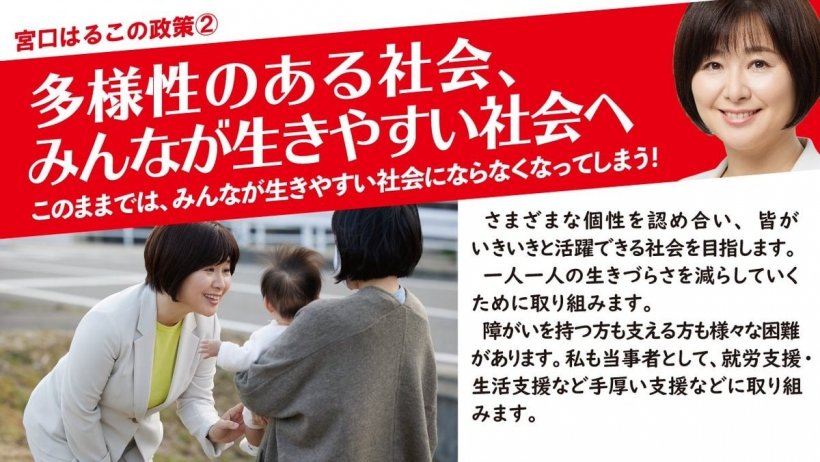 はじめましての皆様に!宮口はるこの政策② 「多様性のある社会、みんなが生きやすい社会へ」 多様性を受け入れつつある社会の変化に政治が遅れてはなりません。 要介護の方、障がいを持つ方やその家族、LGBTQ+の方、さまざまな生きづらさを感じている人たちがいます。 互いの違いを受け入れあい、差別のない、みんなが生きやすい社会を目指します。 #参議院再選挙 #参院選広島 #参院選再選挙 #参院選広島再選挙 #広島 #宮口はるこ #宮口治子 #結集ひろしま #変える勇気その先へ