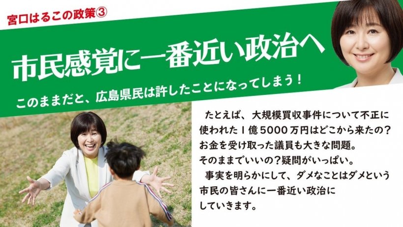 はじめましての皆さまへ!宮口はるこの政策③ 「市民感覚に一番近い政治へ」 政治家は決して遠い存在ではありません。 みなさんの生活に寄り添い、ダメなことにはダメと言える「正直な政治」を貫き、 市民感覚に一番近い政治にしていきます。 #参議院再選挙 #参院選広島 #参院選再選挙 #参院選広島再選挙 #広島 #宮口はるこ #宮口治子 #結集ひろしま #変える勇気その先へ