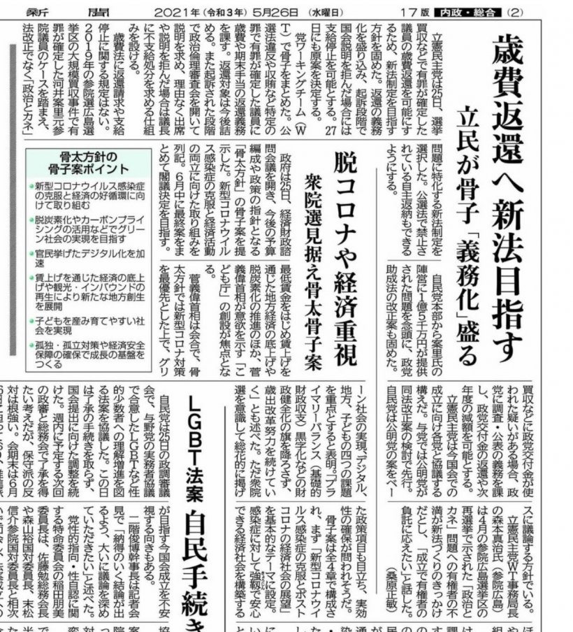 選挙買収などに政党交付金が使われた疑いがある場合、政党に調査、公表を義務付け返還させることをできるようにする政党助成法改正案についてとりまとめました。