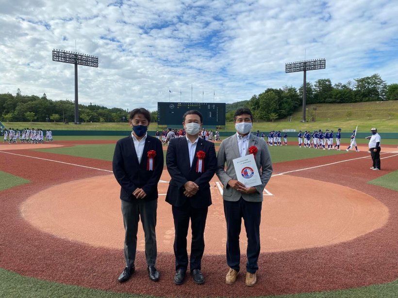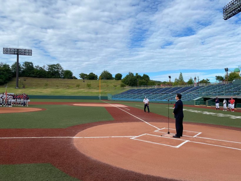 大会顧問を務める「第45回日本少年野球ミズノ旗争奪広島大会」 コロナ禍であり、開会式は行わず県内7球場に分かれて開始式からスタート。 西日本各地から中学生32チーム、小学生3チームが参加です。 同じく大会顧問の瀧本実県議と三次きんさいスタジアムで選手を激励しました。