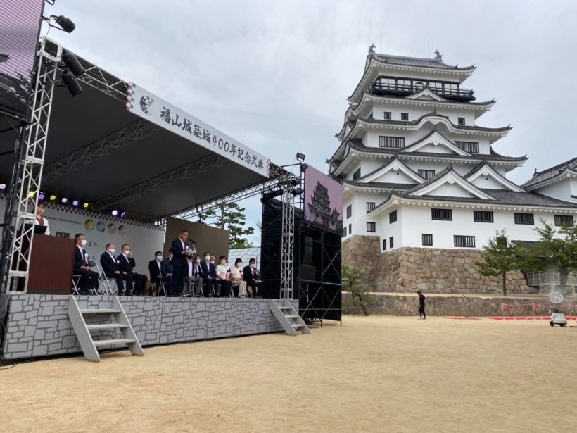 福山城博物館リニューアル記念式典。 築城400年を記念して福山城が新しく生まれ変わりました。最新のデジタル技術を駆使して博物館も魅力的なものになっています。 福山駅も福山城の敷地内にあり、新幹線からもご覧いただけますが、是非新たな福山城に足をお運びください。
