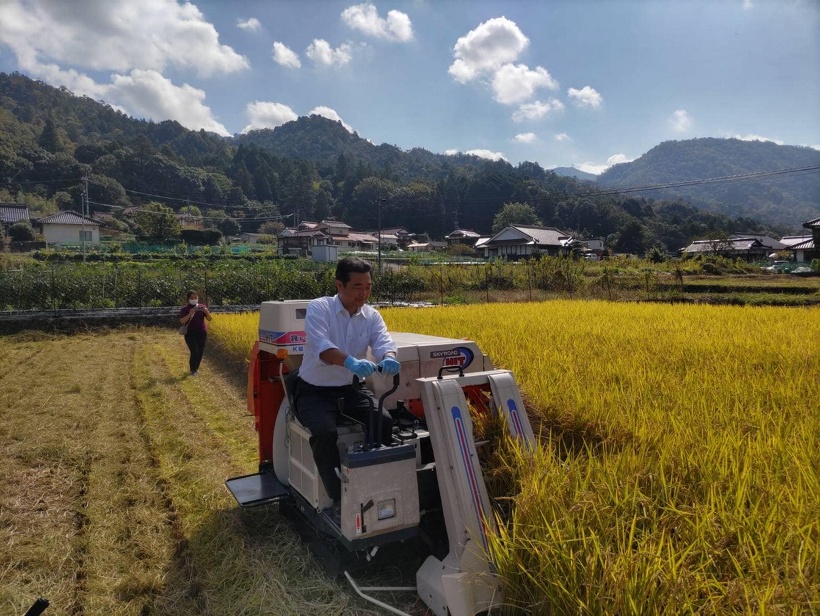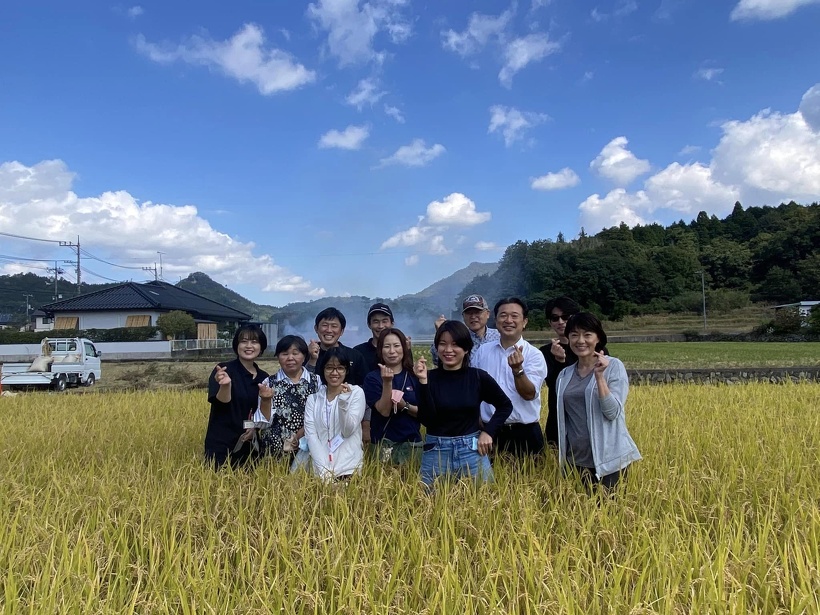 春に三上えり参議院議員と田植えをお手伝いした、山下広島市議から稲刈りをしますとご連絡いただき、午前中白木町におじゃましました。 今日は近くの介護施設で技能実習をされているミャンマーからの女性も参加され楽しい交流会になりました。