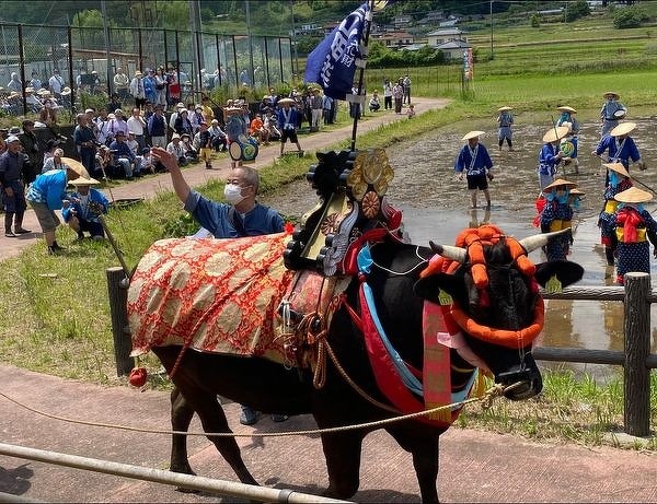 今朝はJAM山陽広島県連絡会のソフトボール大会開会式に宮口治子、三上えり参議院議員と参加。 その後は安芸高田市甲田町に移動し、大土山田楽大花田植へおじゃましました。飾り牛の花さん。娘と同じ名前で親近感を持ちました