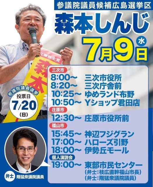明日は、三次市・庄原市・神石高原町・福山市とまわります。 19時~の個人演説会では、 枝広福山市長と階猛衆議院議員が応援弁士としてお越しくださいます。 #参議院議員選挙2025 #広島県 #物価高対策 #ガソリン税25円値下げ #食料品消費税ゼロ #元気もりもり