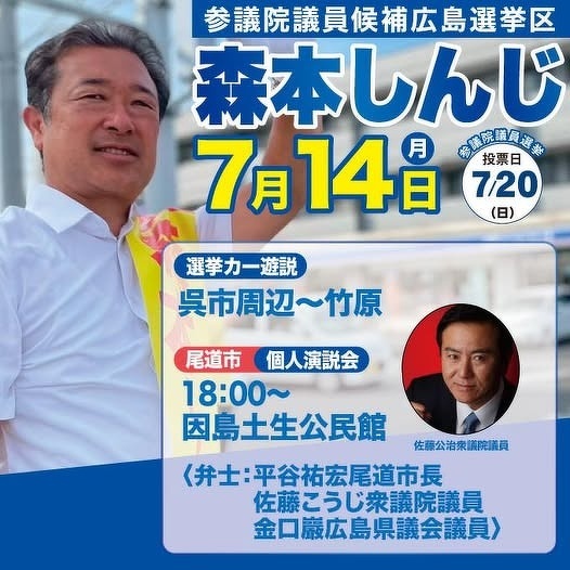 明日は呉市周辺から竹原市とまわります! 【個人演説会】 ?18時~因島土生公民会 平谷祐宏尾道市長もお越しくださいます。 応援よろしくお願いします! #参議院議員選挙2025 #広島県 #物価高対策 #ガソリン税25円値下げ #食料品消費税ゼロ #元気もりもり