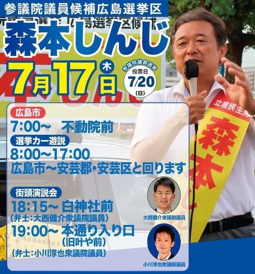 明日は広島市内から安芸郡・安芸区を中心にまわります! どうか、大接戦、皆さんのお力が必要です。 引き続きの応援お願いいたします! #参議院議員選挙2025 #広島県 #物価高対策 #ガソリン税25円値下げ #食料品消費税ゼロ #元気もりもり