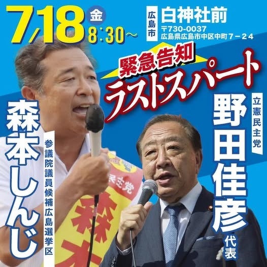 【緊急告知】 明日、野田佳彦衆議院議員が応援に? 8時半~ 白神社で街頭演説をおこないます! 最後の最後ラストスパートです! 皆さんの切実な声、どうか森本しんじに託してください! #参議院議員選挙2025 #広島県 #物価高対策 #ガソリン税25円値下げ #食料品消費税ゼロ #元気もりもり