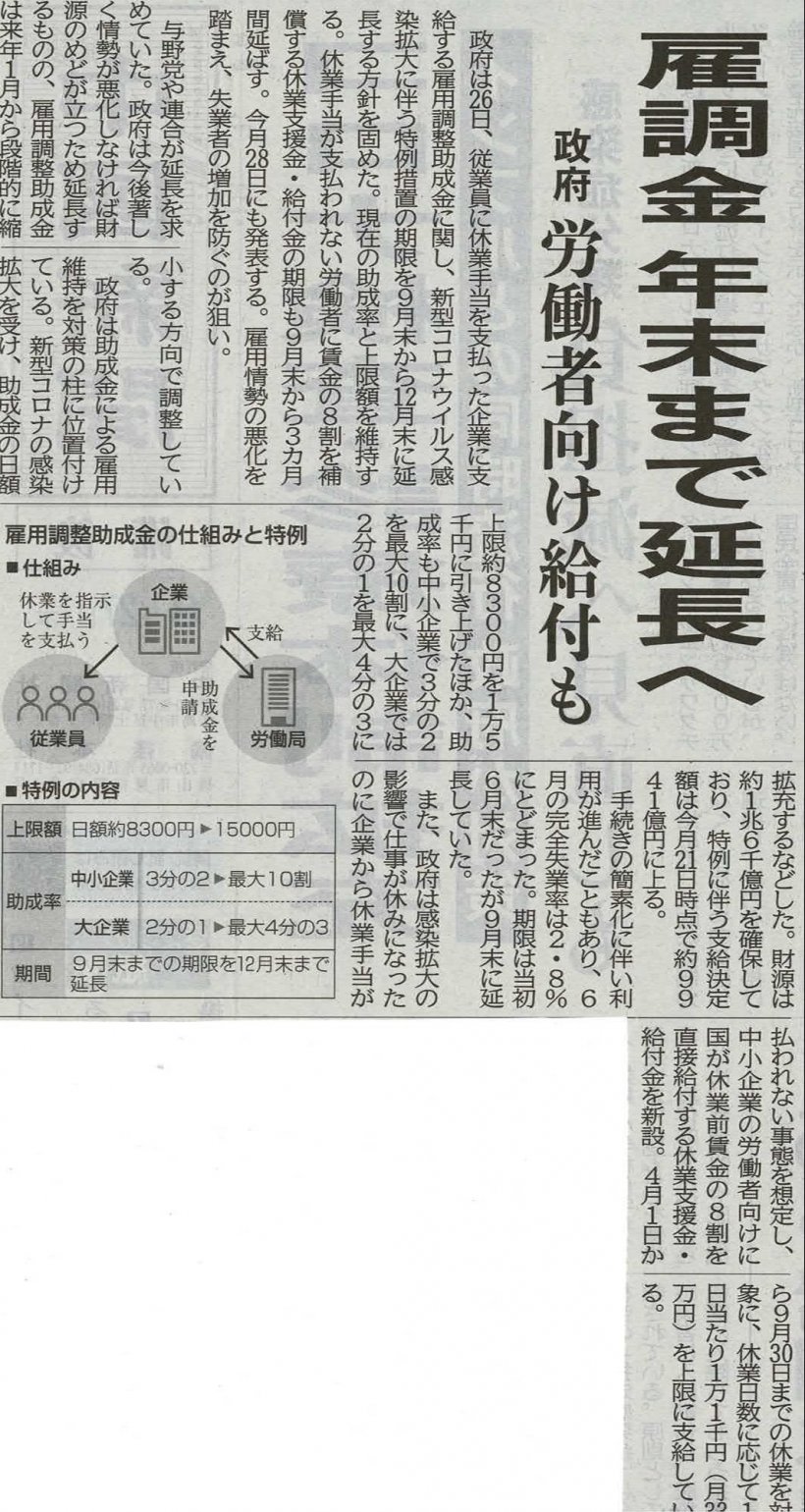 〇雇用調整助成金 年末まで延長へ〇