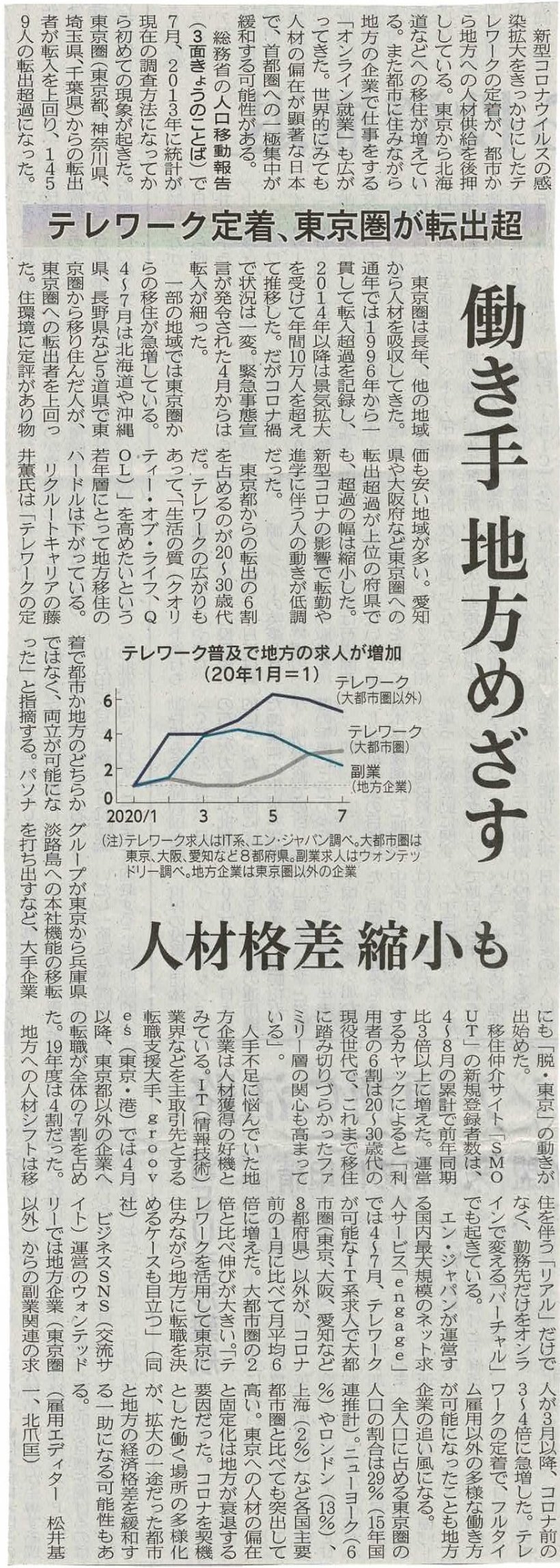先日『働き手 地方を目指す』という日経新聞の記事を読みました。
