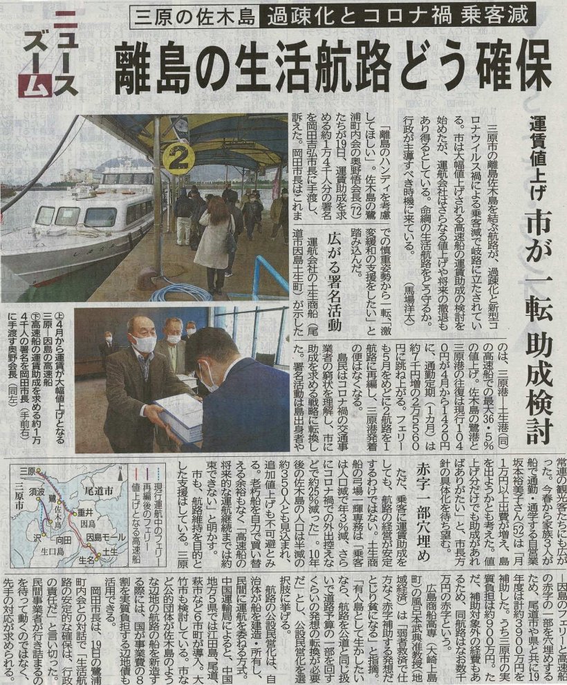 離島の生活航路 どう確保 運賃値上げ 市が一転助成検討(中国新聞)〇