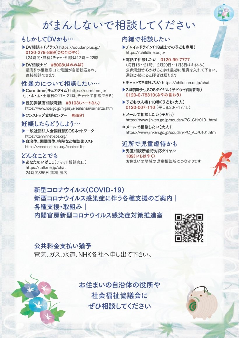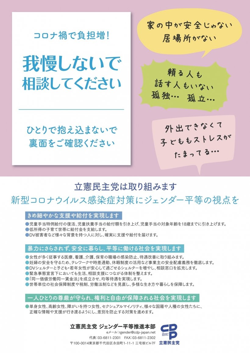 コロナ禍により女性の自殺者が増加しています。 失業による貧困など様々な問題に直面をしている方々にお願したいことはひとりで抱え込まず誰かに相談をしてほしいということです。 現在副本部長を務めさせていただいている「ジェンダー平等推進本部」ではビラを制作しました。 とにかく声をあげてほしい、そして皆さまの周りでも心当たりのある方がいらっしゃれば声をかけていただきたい。 少しでもこのビラが役に立てたらと思っています。