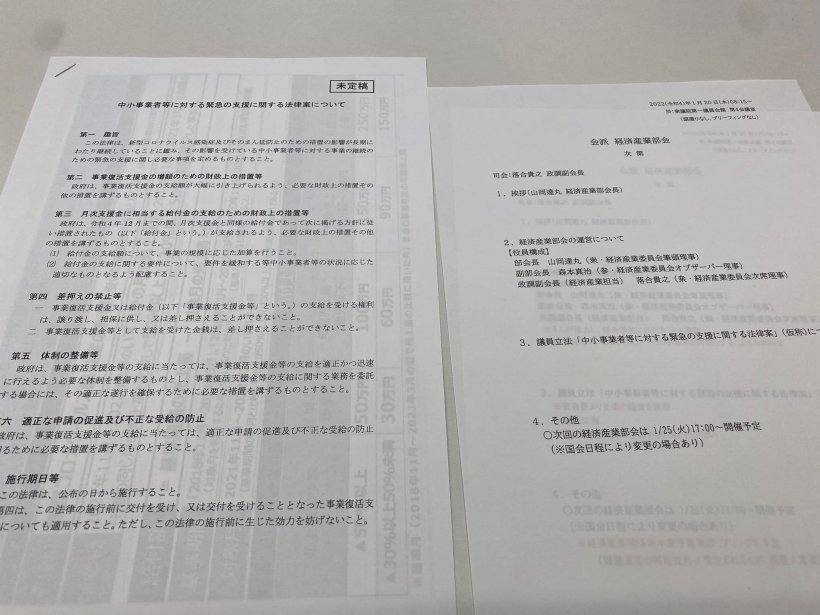 今朝は党の経済産業部会からスタート。 副部会長を務めます。 オミクロン株の感染拡大、まんえん防止予防措置が全国に広がる中、我が党としても早急に緊急経済対策を提起していく必要があり、「中小事業者に対する緊急の支援に関する法律案」を作成しています。
