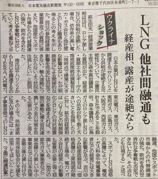先日の経済産業委員会での質問を、一般社団法人日本電気協力会新聞部の記事で取上げていただきました。 現在、ロシアの液化天然ガス(LNG)への依存度が高いガスや電気の企業など、今後ロシア産が途絶した場合の対応などによっては大きな影響が出ると考えられるため、国としてどのような対応を考えているのかなど質問を行いました。最終的には我々の生活に直結する問題でもあり、政府の対応をしっかりと注視していきます。
