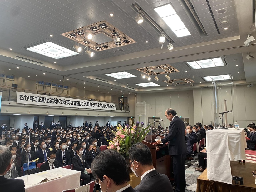 都市基盤整備事業推進大会。全国から自治体の首長さんが集まり、主催者として松井広島市長が挨拶をされました。