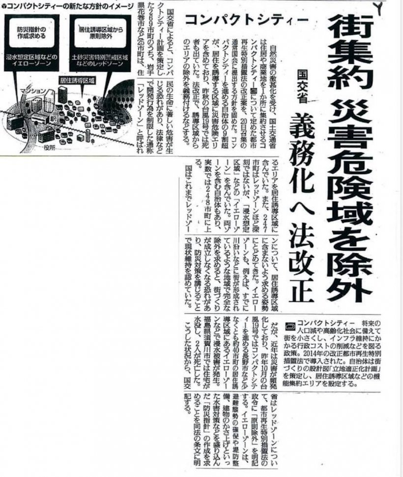 昨年の臨時国会での特別委員会において、現在国が進めているコンパクトシティーの居住誘導エリア内災害危険リスクについて質問をさせていただきました。この記事では『20日召集の通常国会で、災害危険地域の除外を義務付ける法改正を行う』とされ、早速私の質問に対し国交省に対応をしていただきました。