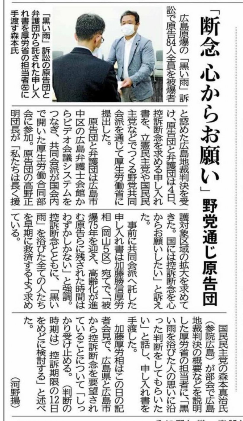「黒い雨」訴訟の原告団、弁護団、 支援する会から厚労省へ控訴断念を求める申し入れ書をあずかり、昨日提出しました。 被告となった広島県、広島市も控訴すべきでないとの立場で、 国は原告の思いに沿った決断をすべきです。