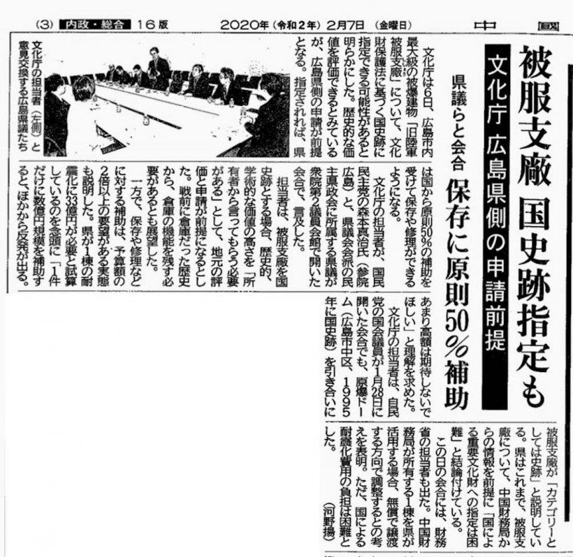 6日文化庁と、広島市内最大級の被爆建物「旧陸軍被服支廠」の保存について会合を開き、国史跡に指定できる可能性のあることがわかりました。