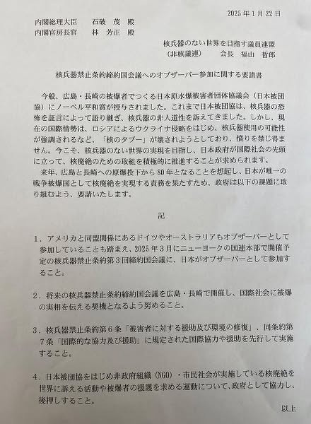 本日、官邸で林官房長官と面会し、核兵器のない世界を目指す議員連盟の福山哲郎会長他役員で、核兵器禁止条約締約国会議へのオブザーバー参加に関する要請を行いました。 4年前の今日、核禁条約が発効した節目の日です。 三月の締約国会議へのオブザーバー参加について現在政府で検討が行われており、官房長官から検討を加速するとのお話がありました。 私からは被爆80年であり、今年は核兵器廃絶に向け重要な年であること。日本の先導的な取り組みについて、改めて広島の声として届けさせていただきました。